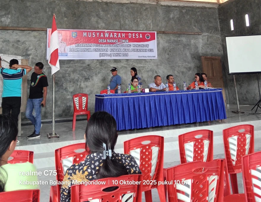 Pemerintah Desa Nanasi Timur telah melaksanakan kegiatan Musyawarah Desa PENETAPAN RENCANA KERJA PEMERINTAH DESA TAHUN 2026 pada Jumat, 10 Oktober 2025 bertempat di Gedung Serbaguna Desa Nanasi Timur pukul 09.00 WITA s/d selesai. Kegiatan ini dihadiri oleh Sekretaris Camat Poigar Ibu. Meyti Lombogia, S.IP beserta jajarannya, Pendamping Lokal Desa, Sangadi Nanasi Timur beserta jajaran perangkat desa, Ketua BPD dan anggota, Ketua RT d serta Tokoh Masyarakat dan Warga Masyarakat Desa Nanasi Timur.